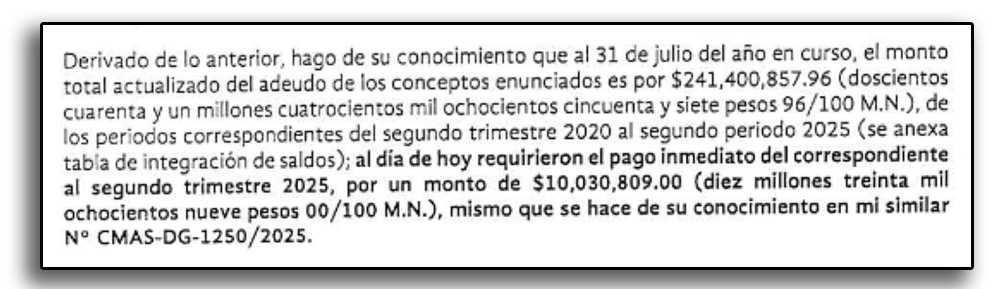 De ese adeudo, el alcalde Amado Cruz Malpica ya había sido enterado mediante el oficio CMAS-DG-1280/2025, según refiere la titular de CMAS.