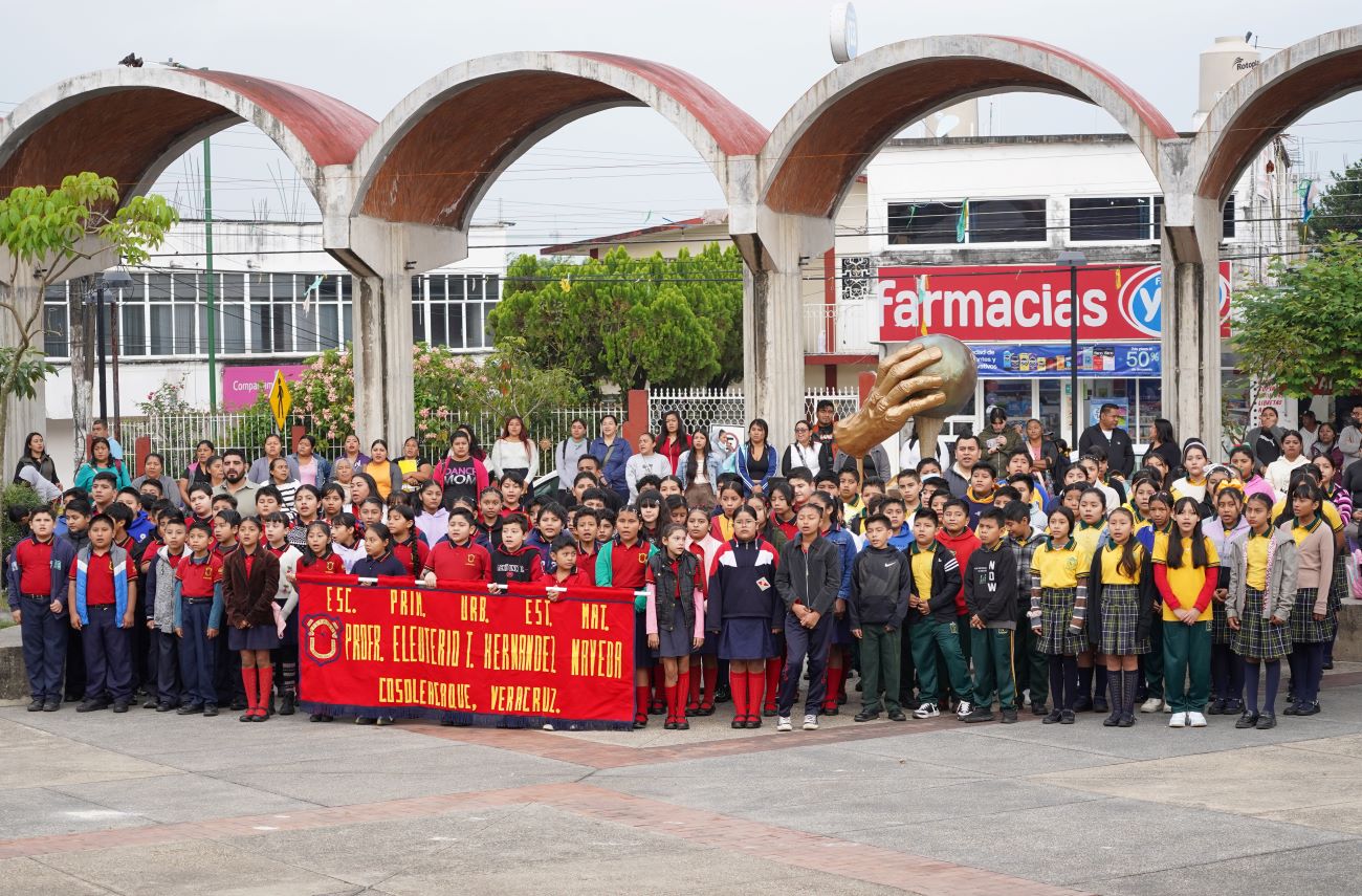 Ediles del H. Ayuntamiento de Cosoleacaque, escolta y banda de guerra de la Policía Municipal, estudiantes, maestros y padres de familia de las escuelas primarias Sebastián Lerdo de Tejada, Prof. Eleuterio T. Hernández Naveda, Héroes de Totoapan, Rafael Ramírez y la telesecundaria Venustiano Carranza participaron en el acto cívico.