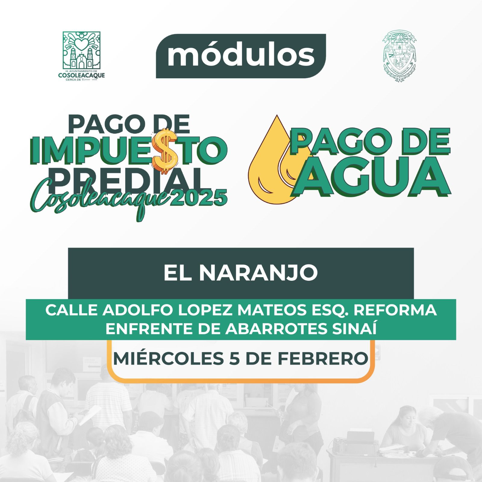 Dará servicio el módulo para pago de predial y agua en El Naranjo, el miércoles 5 distritorojo febrero 4, 2025 Continue Reading Previous: Llegarán las Brigadas de la Belleza a la Colonia Oaxaqueña, el martes 4Next: Alcalde de Cosoleacaque, Ponciano Vázquez Parissi, presente en el cambio de mando de la base aeronaval