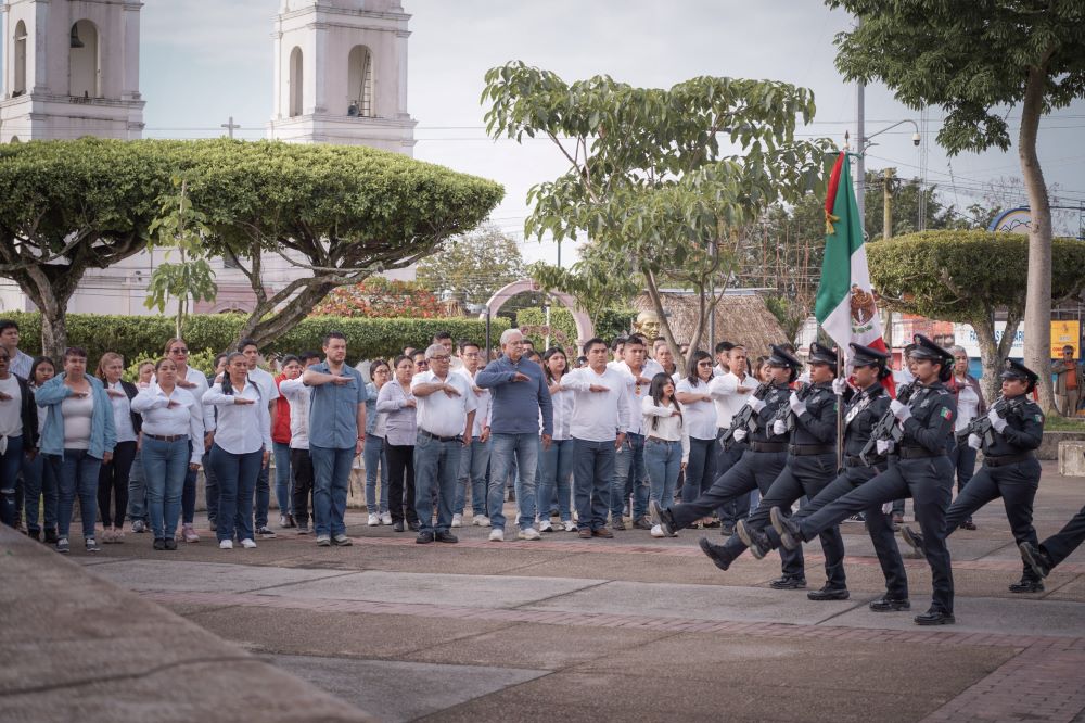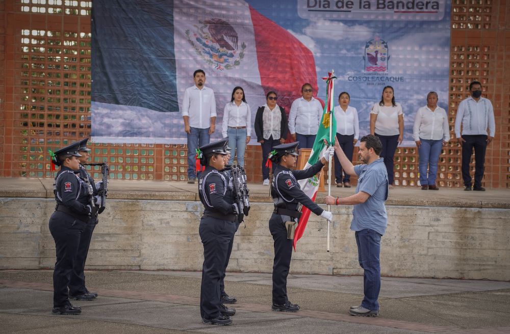 Cosoleacaque, Ver.- El presidente municipal, Cirilo Vázquez Parissi, encabezó el acto cívico para conmemorar hoy 24 de febrero, el Dia de la Bandera de México, símbolo nacional de unidad, historia e identidad, en donde se realizó el izamiento y guardias de honor en la explanada del parque central Miguel Hidalgo.