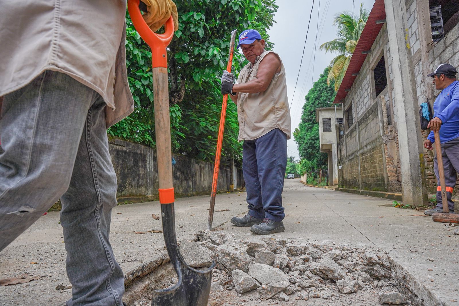 Cosoleacaque, Ver.- Con la finalidad de mantener una óptima circulación y transitabilidad vehicular, se realiza el bacheo en losas de concreto hidráulico del Barrio Primero de la cabecera municipal de Cosoleacaque, en beneficio de los ciudadanos que a diario circulan por estas vialidades.