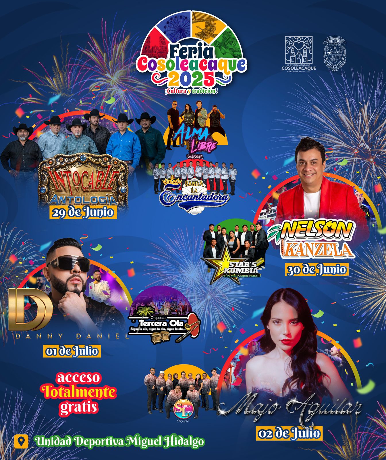 Cosoleacaque, Ver.– El gobierno municipal que encabeza el alcalde Ponciano Vázquez Parissi, presenta la cartelera artística que engalanará del 29 de junio al 02 de julio, la feria Cosoleacaque 2025, en honor a la Preciosa Sangre de Cristo, en la Unidad Deportiva Miguel Hidalgo.
