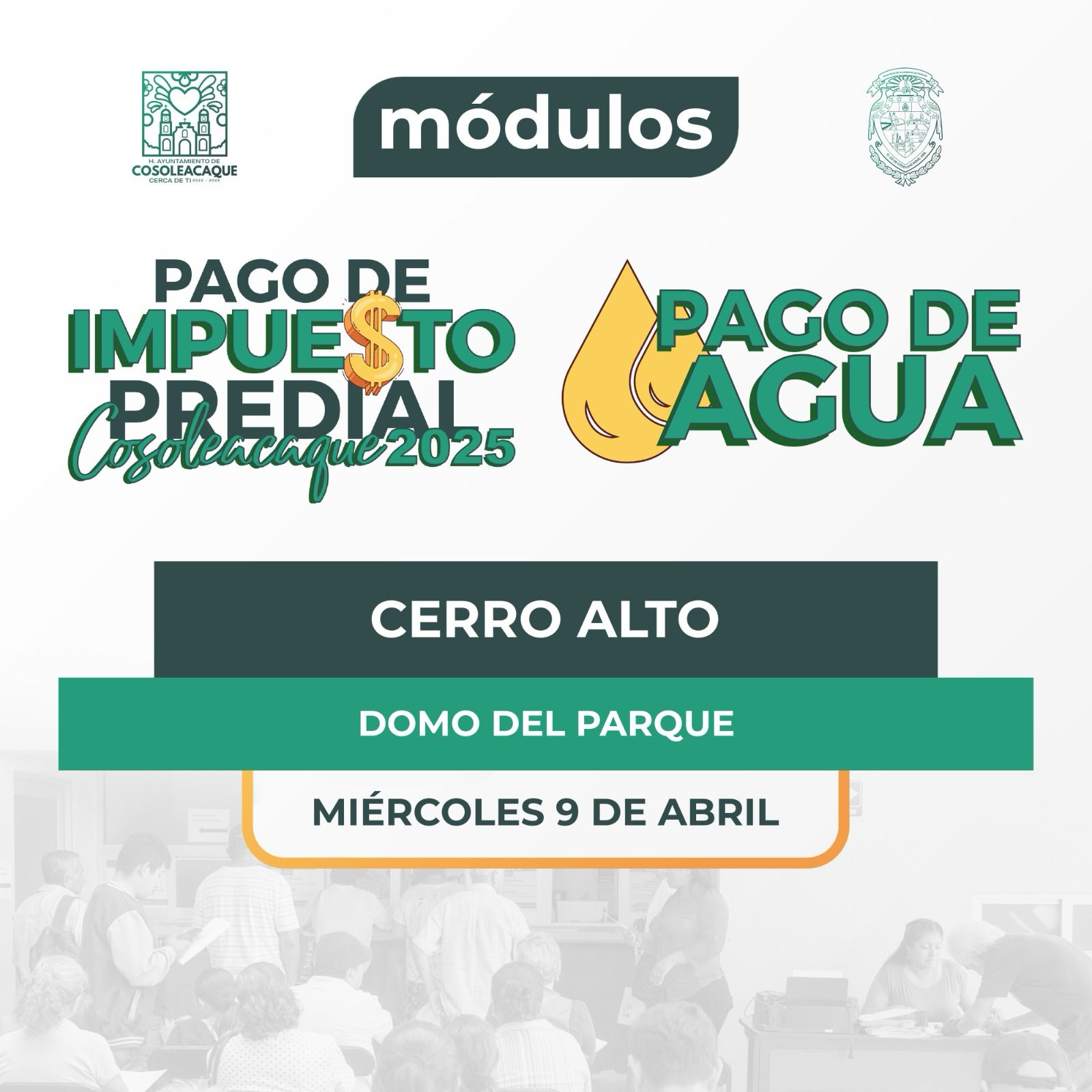 Usuarios podrán pagar predial y agua en el módulo que dará servicio en Cerro Alto, este 9 de abril distritorojo abril 8, 2025 Continue Reading Previous: Banda de Música Militar de la VI región dará concierto en el parque central de Cosoleacaque, este miércoles 9Next: Llegarán las Brigadas de la Belleza a la congregación Kilómetro 14, este 9 de abril