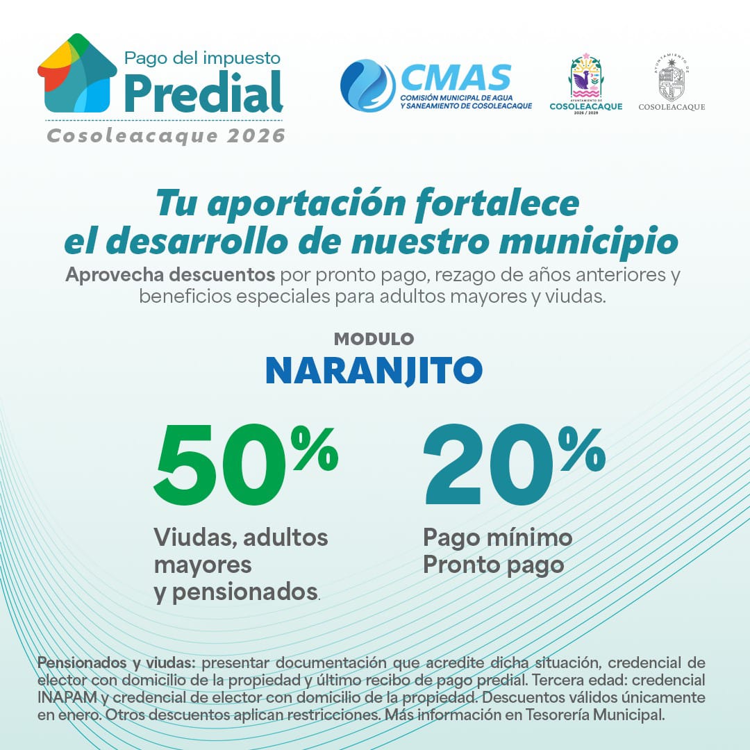 Cosoleacaque, Ver.- Este martes 13 de enero entra en función el módulo foráneo de la colonia Naranjito, donde la ciudadanía podrá realizar sus pagos de agua y predial con descuentos del 50% para pensionados, viudas y adultos mayores, así como 20% por pronto pago.